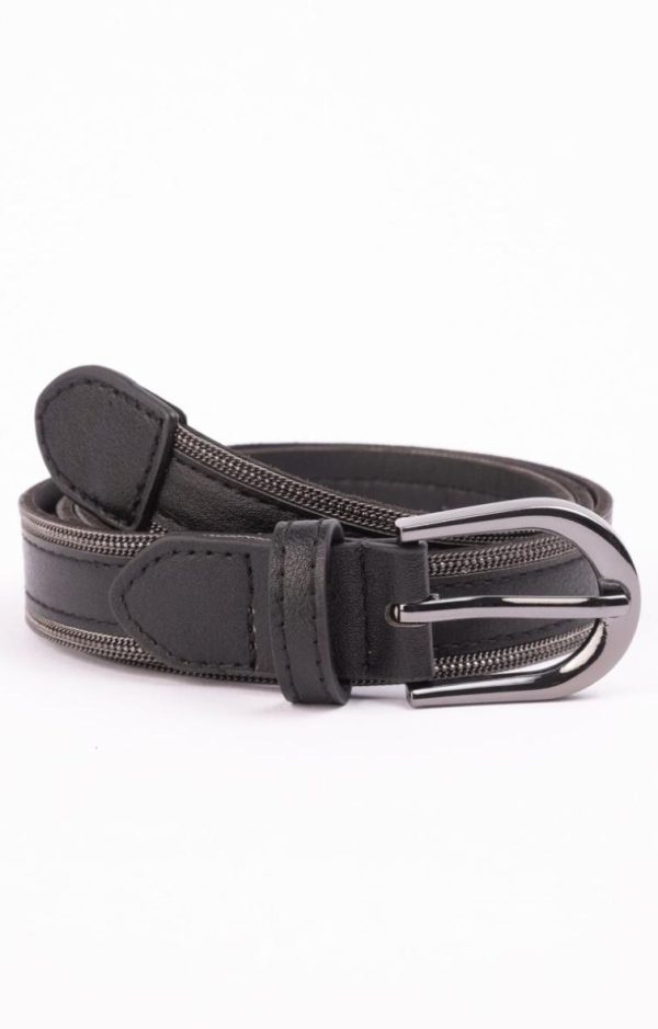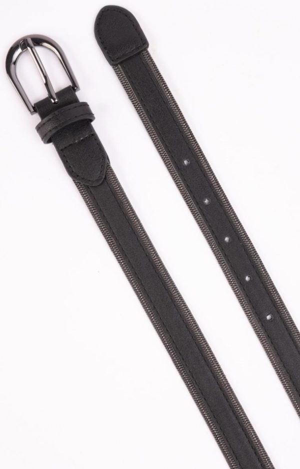Ceinture fine façon cuir uni avec chaînette. Ceinture façon cuir grainé. Modèle uni. Fermeture boucle métallique à ardillon. Passant et empiècement du bout de ceinture assortis à la sangle. Sangle bordée de 3 rangées de chaînettes métalliques à maille cheval serrée. Chaînette effet métal vieilli. Bout biseauté. Fines surpiqûres ton sur ton en finition.