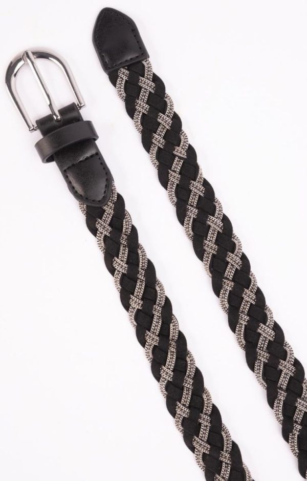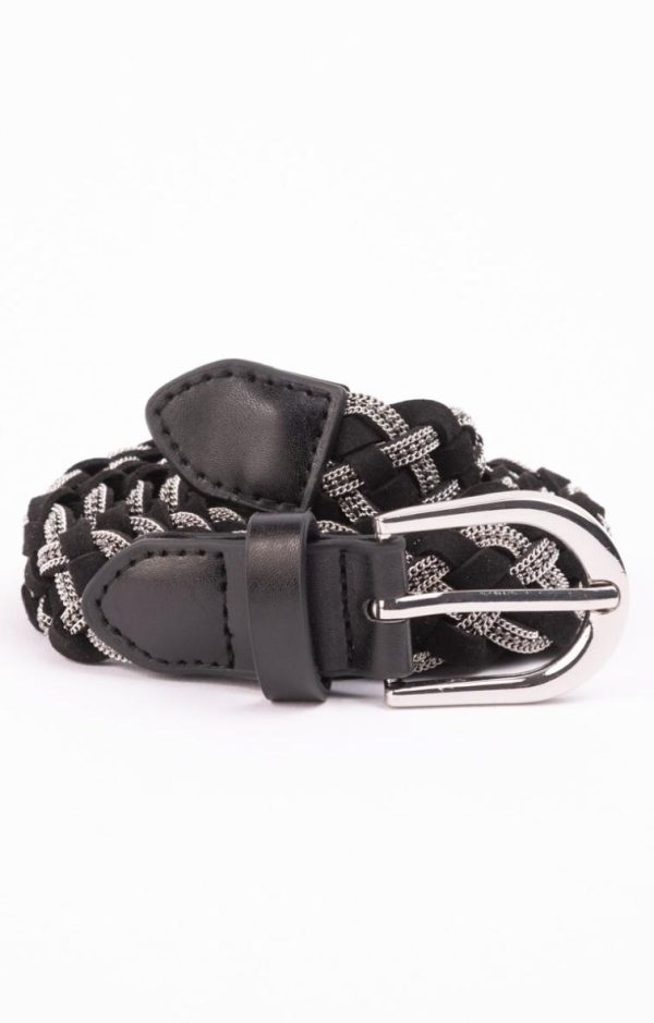 Ceinture fine tressée façon cuir avec chaînettes. Sangle tressée combinant lanières façon cuir suédé et chaînettes en métal. Ensemble de chaînes à maille cheval serrée et chaîne mini boules. Modèle ceinture 2 tons. Ceinture fermée avec boucle ovale en métal à ardillon. Fixation boucle, passant et bout de ceinture biseauté façon cuir grainé. Surpiqûres ton sur ton en finition.