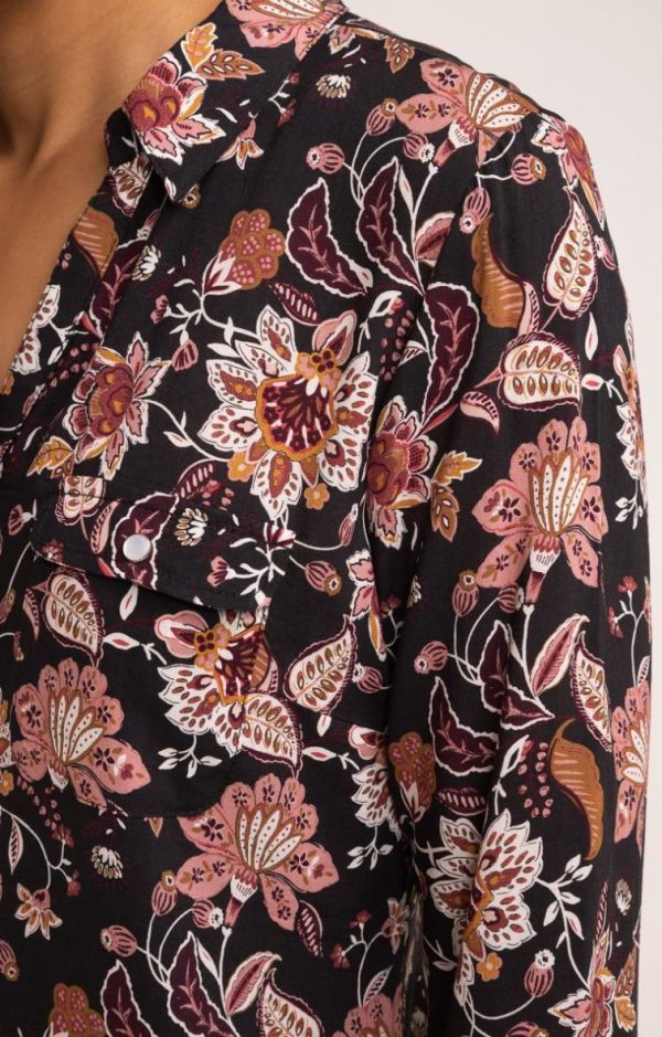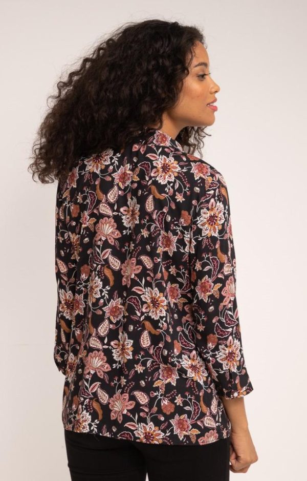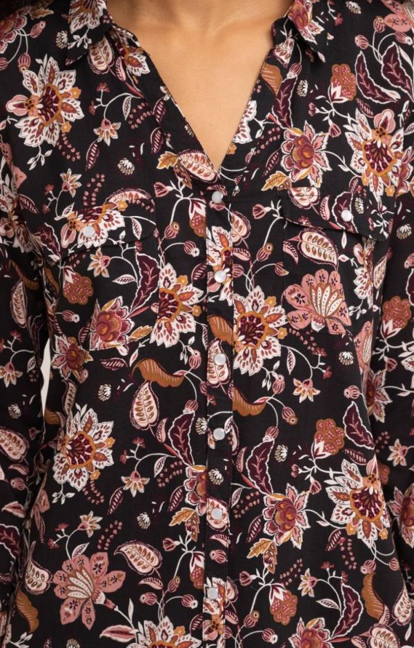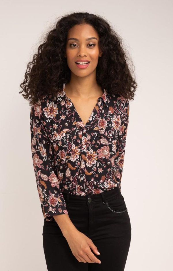 Chemisier floral à manches 3/4 détail boutons métal et nacre. Coupe droite mi-longue. Emmanchures droites. Manches 3/4 à poignets boutonnés. Col chemise sur col en V. Ouverture boutonnée devant, petits boutons à queue en métal et nacre. Une poche poitrine à rabat boutonné. Imprimé multicolore, motif fleurs inspiration orientale sur l’ensemble. Matière fluide.Notre mannequin Cindy mesure 1m77 et porte un chemisier taille 1.