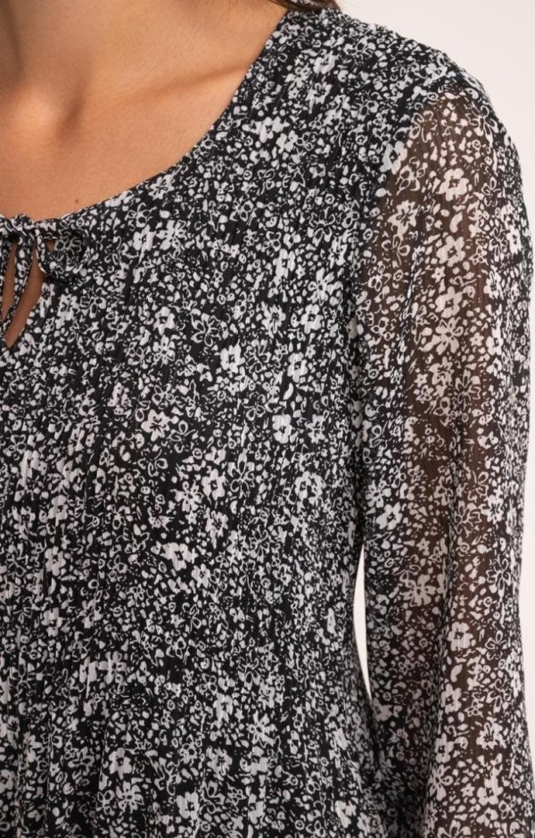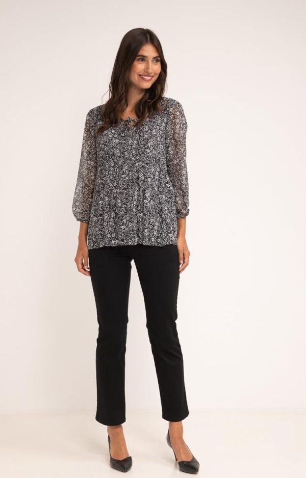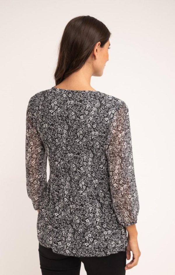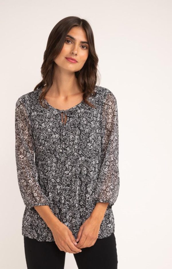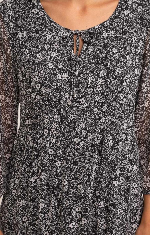 Tunique florale bicolore à manches bouffantes en voile transparent. Coupe droite mi-longue. Manches 3/4 bouffantes semi-transparentes sur emmanchures droites. Col rond avec fente et lien à nouer devant. Imprimé floral bicolore sur l’ensemble. Tissu fin et léger. Finition bourdon à la base. Doublure corps.Notre mannequin Laura mesure 1m78 et porte une tunique taille 1.