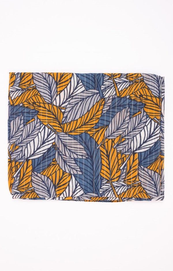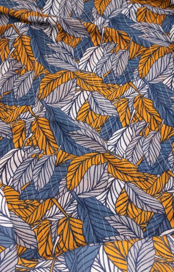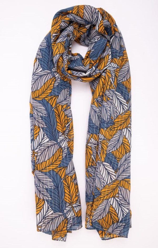 Grand foulard imprimé avec rayures métallisées. Grand format rectangulaire. Matière fine et fluide, légèrement transparente. Imprimé à motif feuilles tricolores sur fond à fines rayures métallisées. Bords ourlés. Portez ce foulard moderne avec vos tenues du quotidien : robe fluide et bottes à talons ou pantalon slim et chemisier, sous une veste mi-longue cintrée.