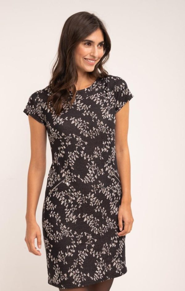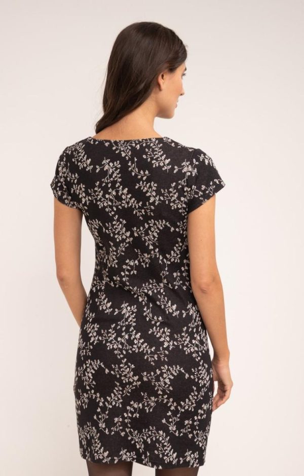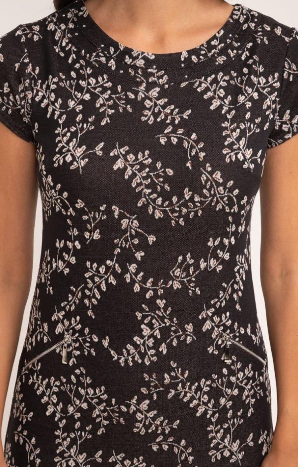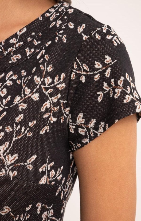 Robe courte cintrée à manches courtes en maille extensible à motifs végétaux multicolores tissés. Coupe cintrée courte. Manches courtes. Emmanchures droites. Col rond à double découpe. Motifs rameaux de feuilles multicolores tissés sur fond uni. Maille extensible. Composition contenant du coton.Notre mannequin Laura mesure 1m78 et porte une robe taille 38.